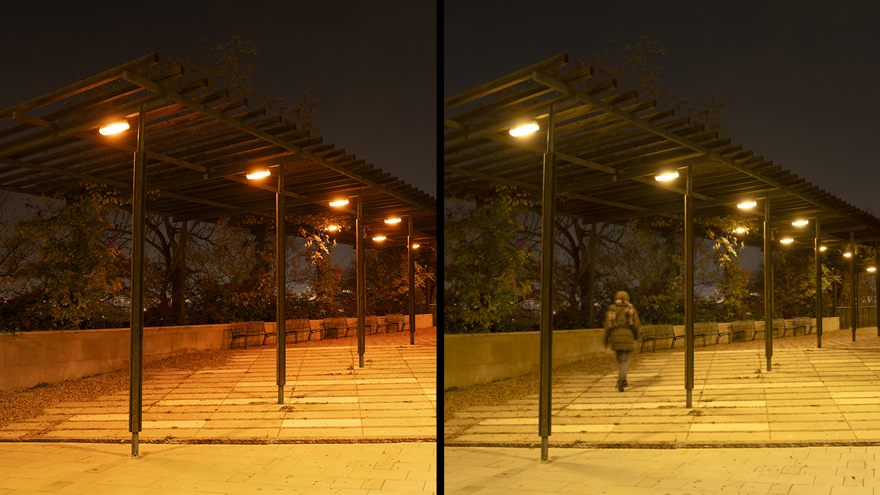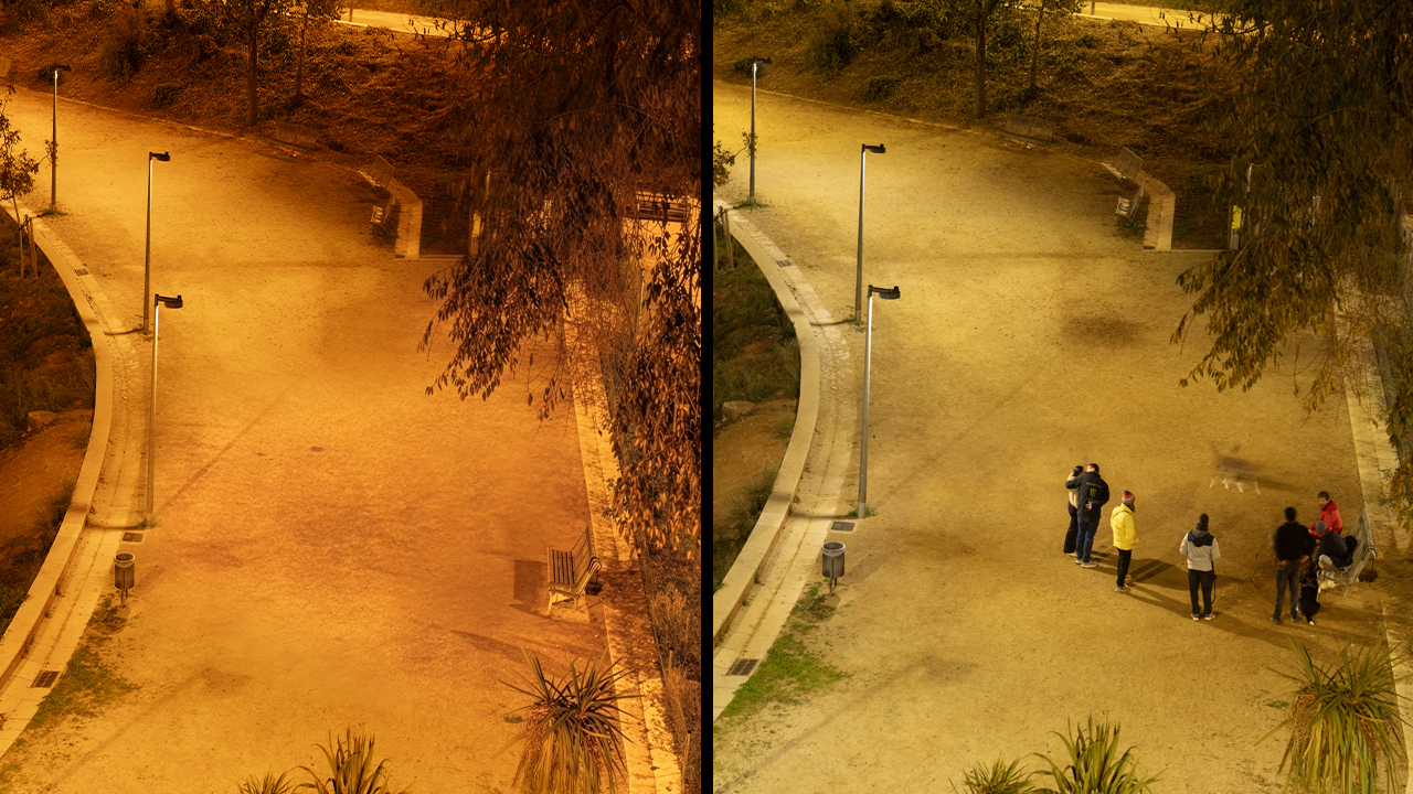 Ejemplo de iluminación dinámica en la pérgola del Parc del Molinet. A la izquierda, en ausencia de actividad, el alumbrado funciona con luz ámbar. A la derecha, tras la detección de presencia, el sistema ajusta la temperatura a 3000 K.