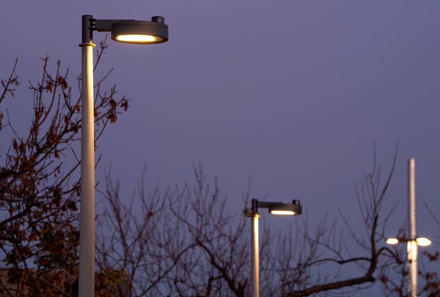 Detalle de las luminarias Spin, en primer plano, y Mikos, al fondo, con nodo de comunicación.