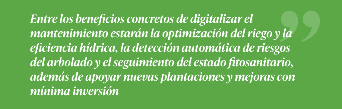 Tradicionalmente, el mantenimiento de las zonas verdes ha dependido de inspecciones presenciales y respuestas a incidencias ya manifestadas, lo que incrementa el riesgo y los costes. Con el apoyo de tecnologías avanzadas -drones, mobile mapping, sensores y modelos de inteligencia artificial- será posible anticipar problemas como incidencias de ramas en señalización o fachadas, estrés hídrico o deterioro estructural de los árboles y actuar antes de que se conviertan en situaciones críticas. Este cambio no solo aportará agilidad, sino también mayor seguridad y una gestión más racional de los recursos.