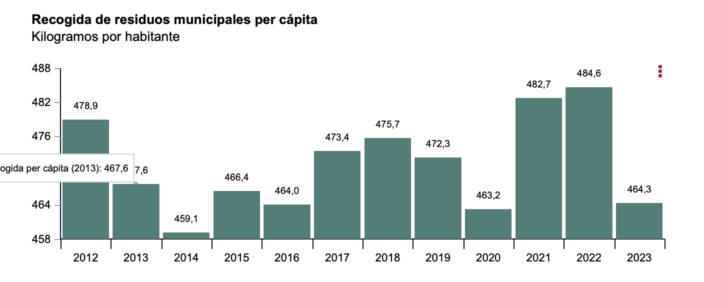 En términos per cápita, en España se recogieron 464,3 kilogramos de residuos municipales por persona y año en 2023, un 4,2% menos que en el ejercicio anterior. De esta cantidad, 353,1 kilogramos correspondieron a residuos mezclados y 111,2 kilogramos a recogida separada.
