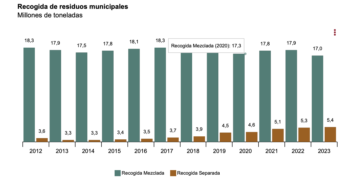 Del total gestionado, 17,1 millones de toneladas correspondieron a residuos mezclados y 5,37 millones a residuos de recogida separada. Esto se traduce en que el 76,1% del total recogido sigue llegando a los sistemas municipales sin separación previa, mientras que el 23,9% ya se canaliza por circuitos selectivos.