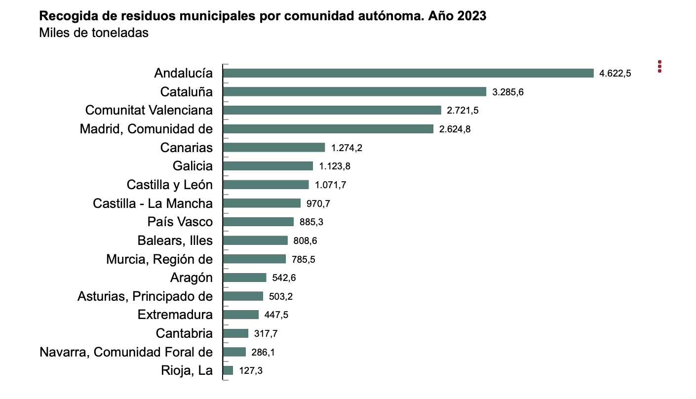 Por comunidades autónomas, Andalucía fue la región que más residuos municipales recogió en 2023, con 4,62 millones de toneladas. Le siguieron Cataluña, con 3,29 millones, y Comunitat Valenciana, con 2,72 millones de toneladas. Madrid se situó a continuación, con 2,62 millones.