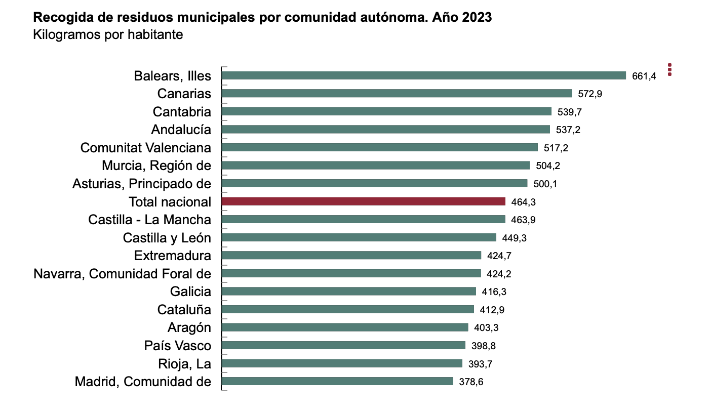 Si se analiza la recogida per cápita, Illes Balears encabezó la clasificación con 661,4 kilogramos por persona y año, seguida de Canarias (572,9 kilogramos) y Cantabria (539,7 kilogramos). Andalucía (537,2 kilogramos) y Comunitat Valenciana (517,2 kilogramos) también se situaron por encima de la media estatal.
