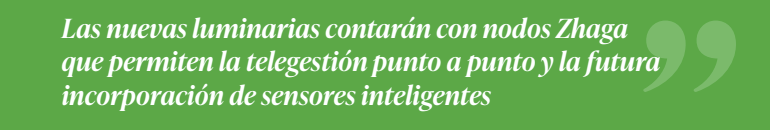 Estos nuevos 15.000 puntos de luz dispondrán de nodos de telegestión punto a punto mediante nodo Zhaga en la parte superior, además de la telegestión de la que ya disponen actualmente los 300 cuadros eléctricos que conforman las instalaciones de alumbrado público. Asimismo, estas 15.000 luminarias también contarán con un nodo de conexión Zhaga en la parte inferior, que permitirá instalar sensores inteligentes. De momento, se instalarán 200 multisensores inteligentes, que incorporan sensor de presencia para realizar iluminaciones dinámicas, sensor de contaminación ambiental, sensor de contaminación acústica, etc.
