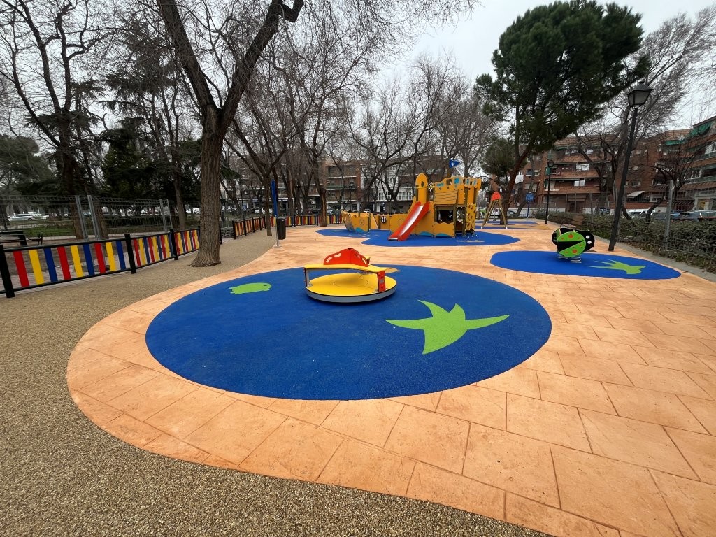 Se cuida especialmente la ejecución en torno a los árboles, protegiendo los cuellos y evitando compactaciones que puedan dañar las raicillas. Además, se apuesta por geometrías fluidas, con bordes curvos, que suavizan la lectura del espacio y contribuyen a generar recorridos intuitivos y visualmente agradables tanto para el público infantil como adulto.