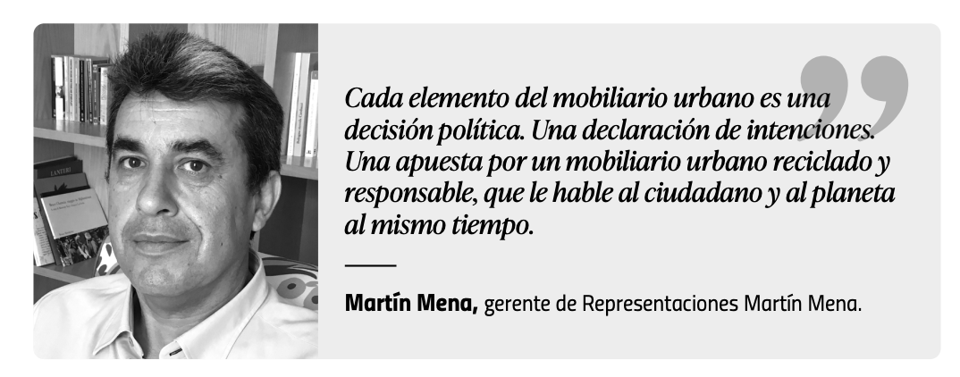 Representaciones Martín Mena SL comparte la importancia de estos criterios, que aplica en sus productos con una filosofía orientada a la durabilidad, la integración en el entorno y el mínimo impacto ambiental. Pero subraya también la dimensión social del diseño. “No se trata solo de poner bancos bonitos con principios de la economía circular. Se trata de generar entornos saludables”, explica su gerente, Martín Mena. Sus soluciones no solo buscan reducir la huella ambiental —evitar residuos, mejorar la biodiversidad, disminuir la huella de carbono—, sino también crear espacios que absorban calor, inviten al descanso y fomenten la convivencia. “Cada elemento del mobiliario urbano es una decisión política. Una declaración de intenciones. Una apuesta por un mobiliario urbano reciclado y responsable, que le hable al ciudadano y al planeta al mismo tiempo”, concluye el gerente.