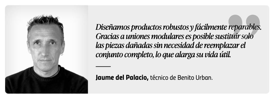 Jaume del Palacio, técnico de Benito Urban, subraya que esta filosofía permite “sustituir solo las piezas dañadas sin necesidad de reemplazar el conjunto completo”, prolongando así la vida útil. Además, el diseño es adaptable y permiten integrar el mobiliario en diferentes entornos sin necesidad de fabricar nuevos elementos, lo que contribuye a reducir significativamente el uso de recursos. En la misma línea, Carlos Fábregas, gerente de Grup Fábregas, explica que en su empresa el diseño modular y desmontable “evita que los productos acaben en vertederos”, al posibilitar su reciclaje completo al final de su ciclo de uso.