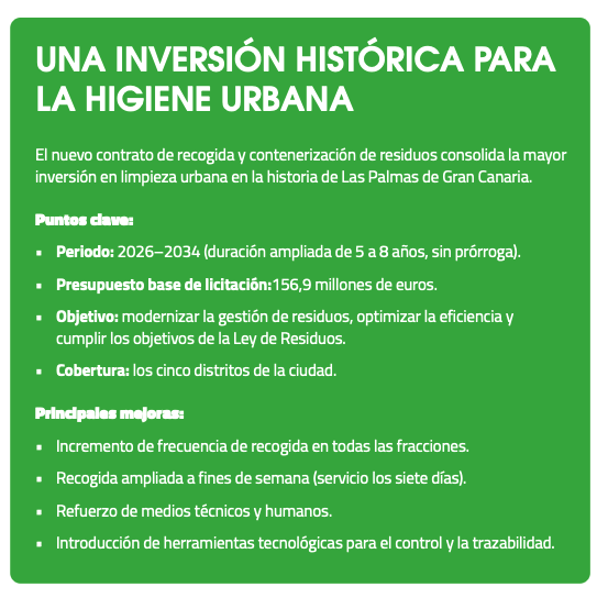 Las Palmas de Gran Canaria ha dado un paso decisivo en su compromiso con la sostenibilidad y la limpieza urbana después de que el Ayuntamiento aprobase el nuevo contrato de recogida de residuos y contenerización, con una inversión récord de 156,9 millones de euros para el periodo 2026-2034, la mayor destinada nunca a esta materia en la historia de la ciudad. Gracias a esta iniciativa será posible renovar por completo la flota municipal, con más de un centenar de vehículos nuevos, e instalar más de 10.000 contenedores de última generación, algunos con cerradura electrónica, que reforzarán la recogida selectiva y facilitarán la separación de residuos en todos los barrios.