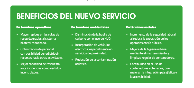 El modelo implantado se erige como una referencia en la gestión local de residuos en España, al integrar de forma conjunta robotización, electrificación y el uso de combustibles sostenibles